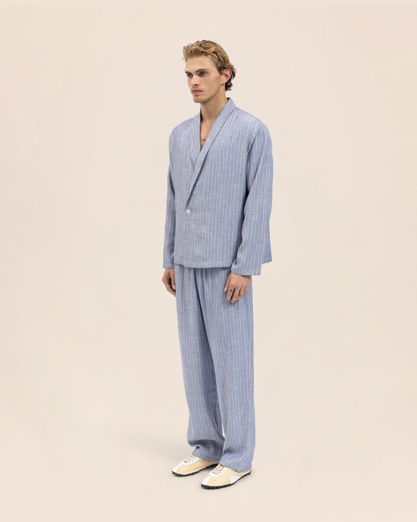 Our ever evolving soft tailoring collection gets an elevated revamp for 2025 in the form of the Arta Shawl Double Breasted Jacket in Blue. This elevated blazer is the perfect transitional day-to-night garment, with a silhouette perfect for solo wear or as a layering piece. Designed and produced locally in England, this product proudly boasts our efforts in minimising our carbon footprint as much as we can.