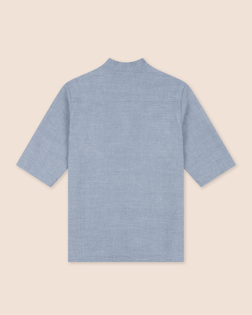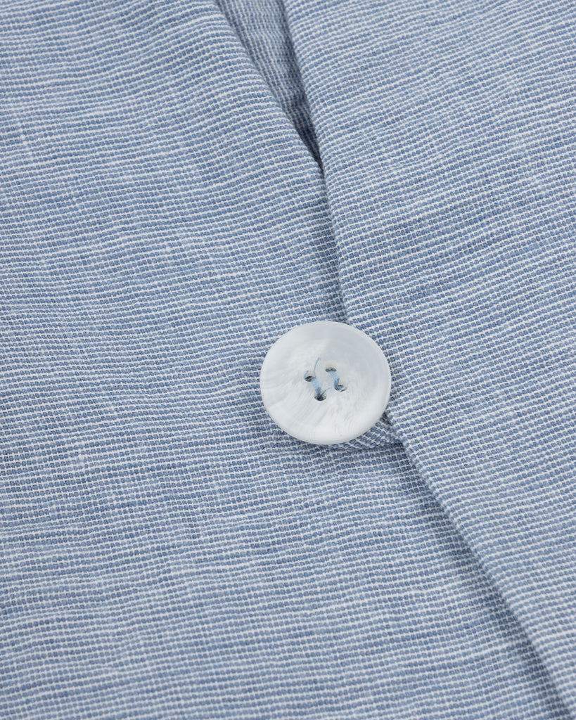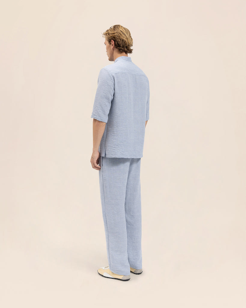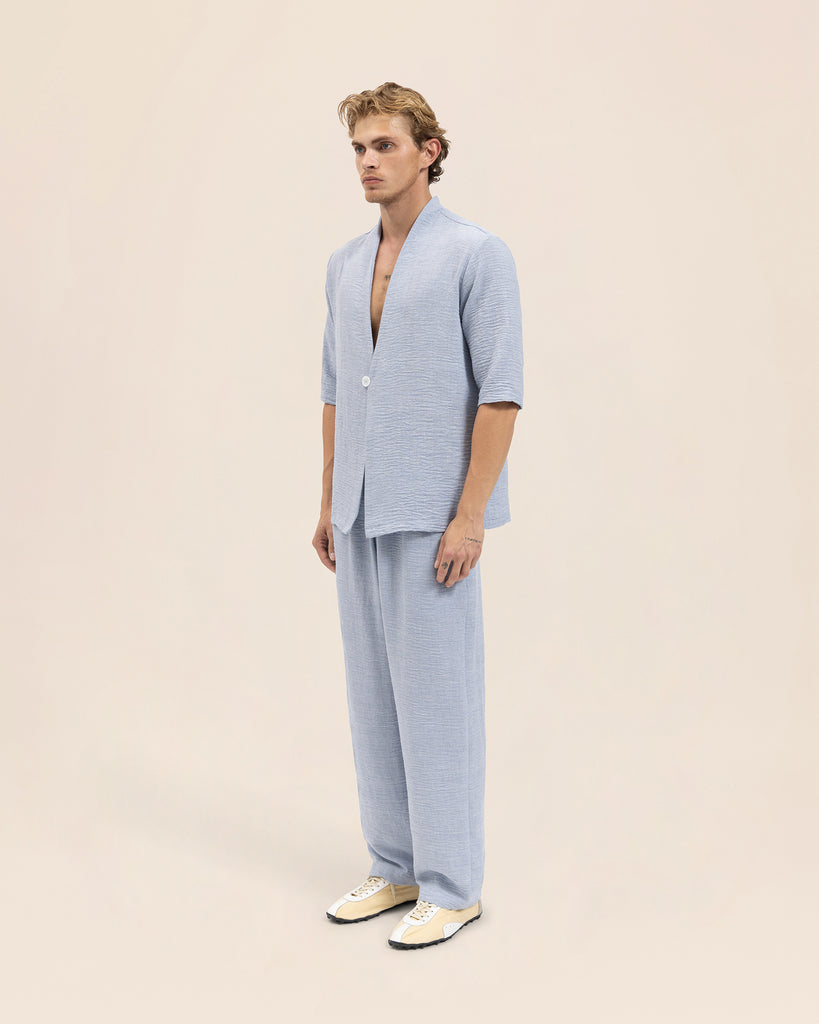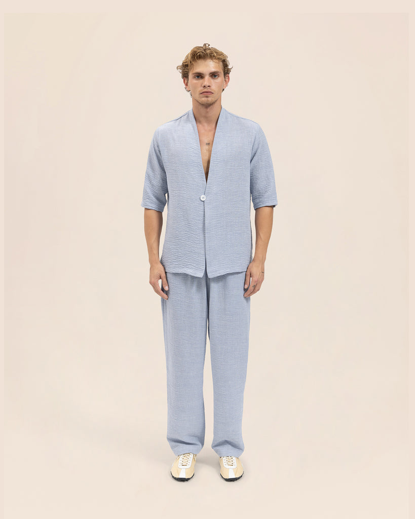 New for Summer 2025, in the form of the Cana Short Sleeve Jacket in blue. This elevated short sleeve jacket is the perfect transitional day-to-night garment, with a silhouette perfect for solo wear or the matching resort pant.