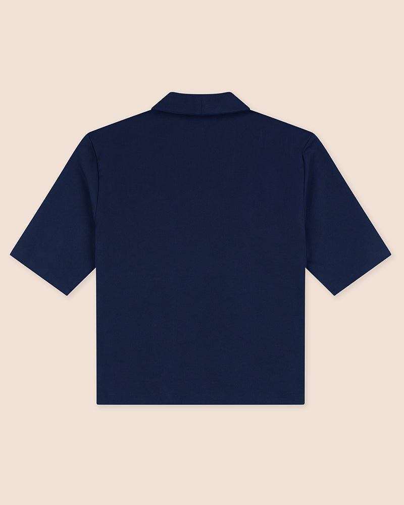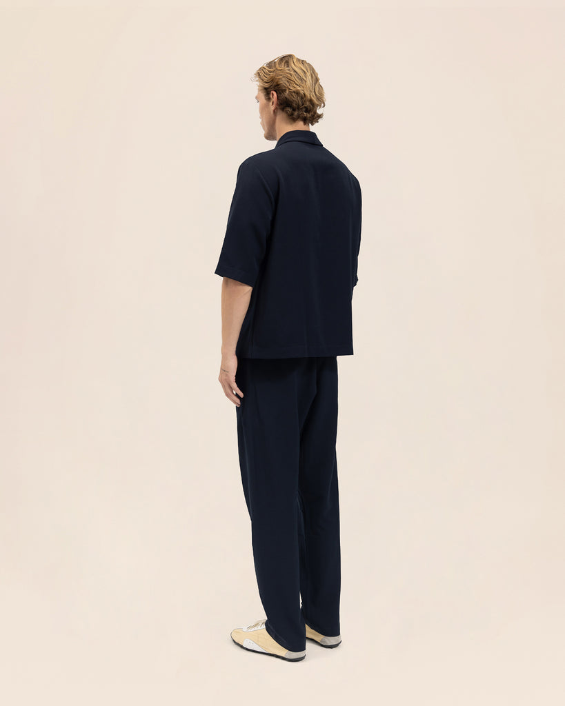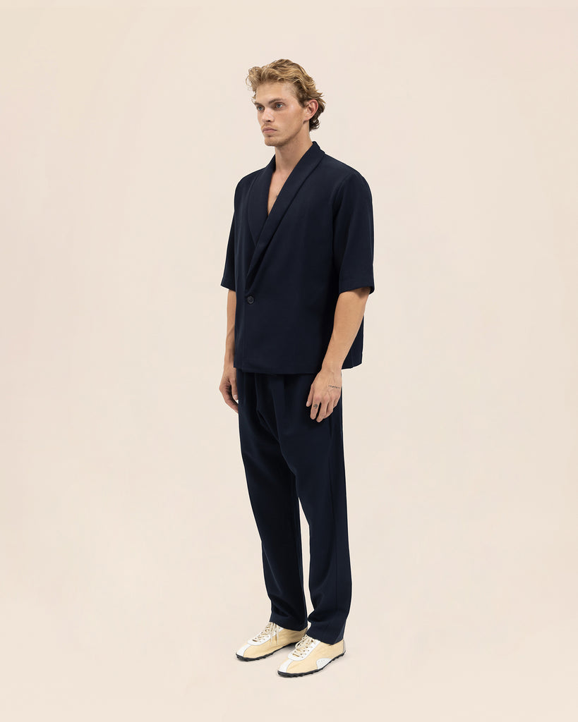 Our ever evolving soft tailoring collection gets an elevated revamp for 2025 in the form of the Cana Short Sleeve Shawl Double Breasted Jacket in Navy Blue.