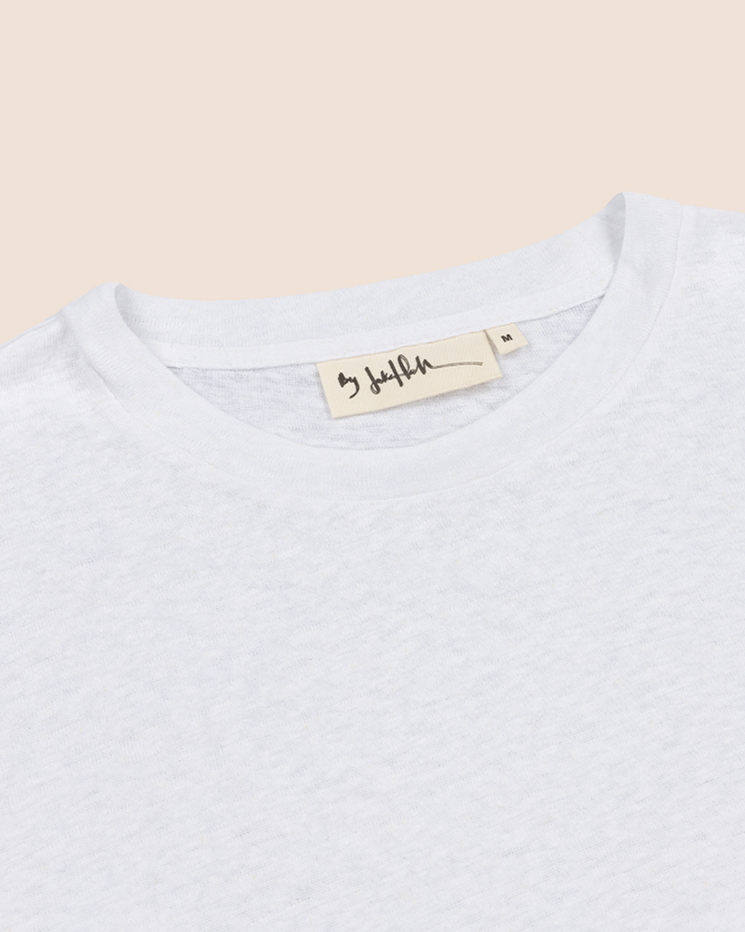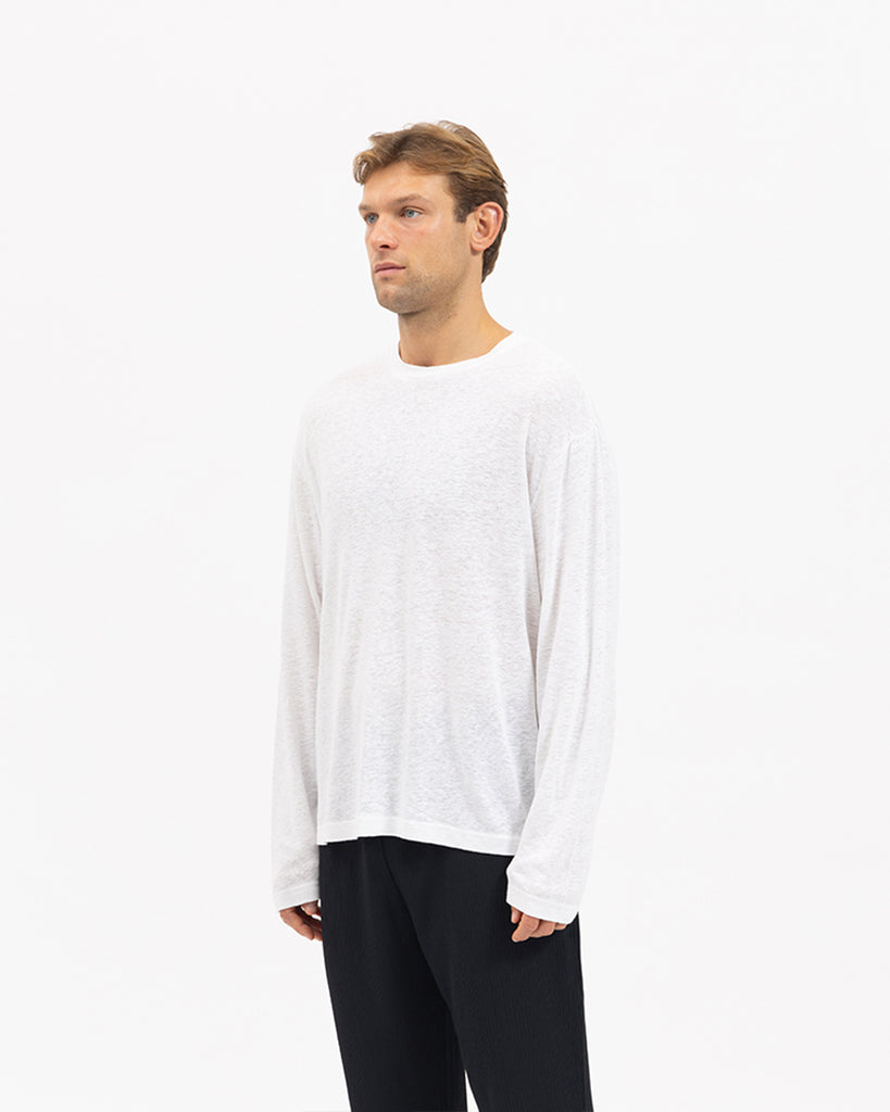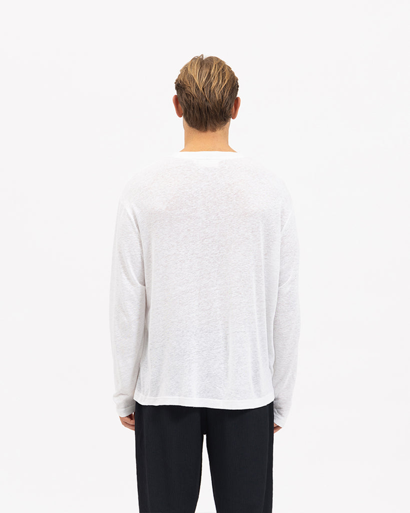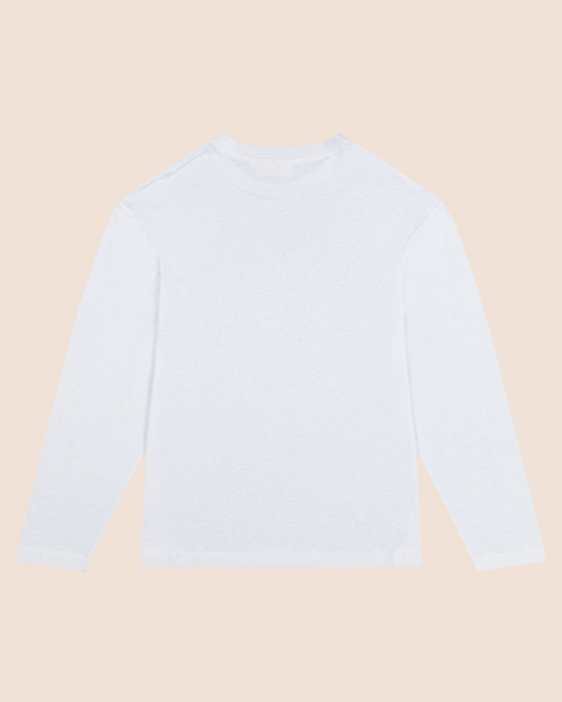 The Serralta Long Sleeve Tee in White. Constructed from light-weight linen blend fabric in relaxed and effortless silhouette, these elevated wardrobe staples are perfect for everyday wearing.