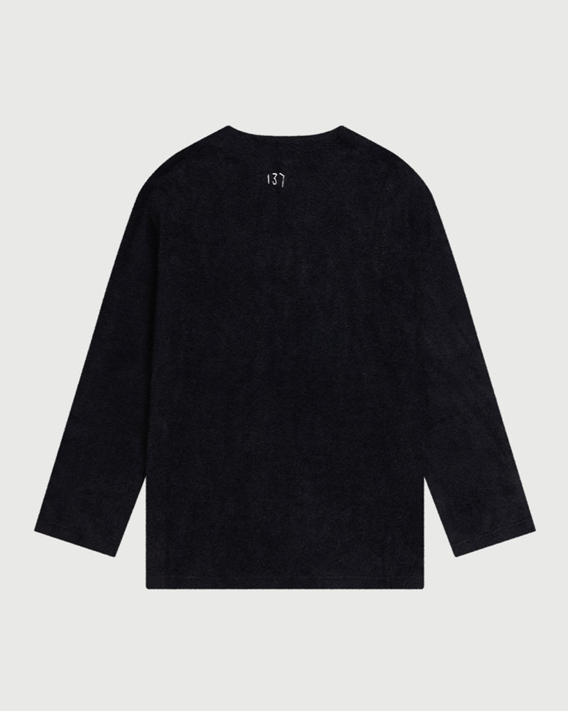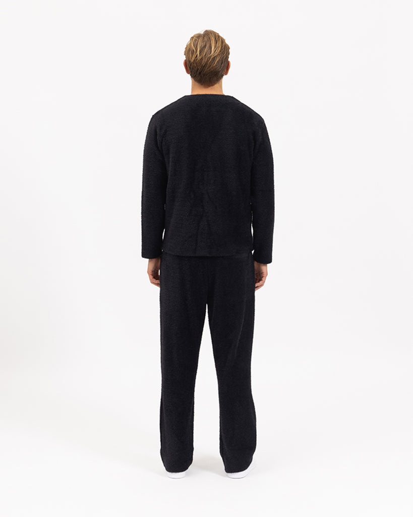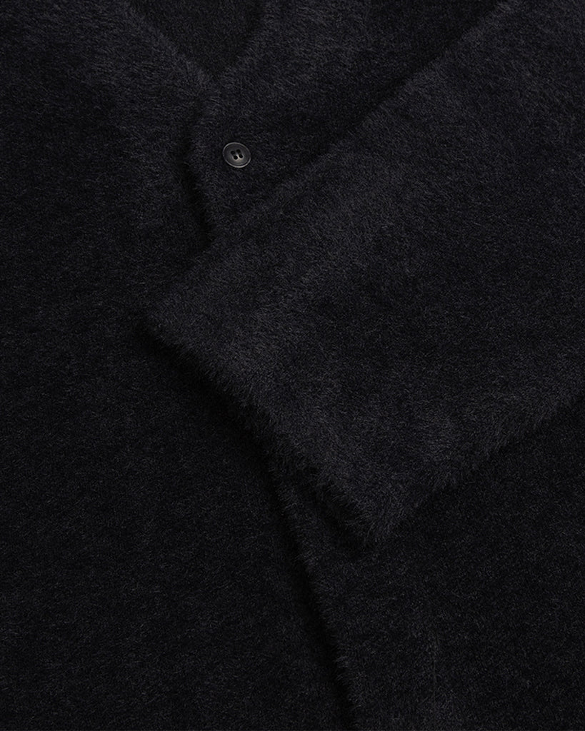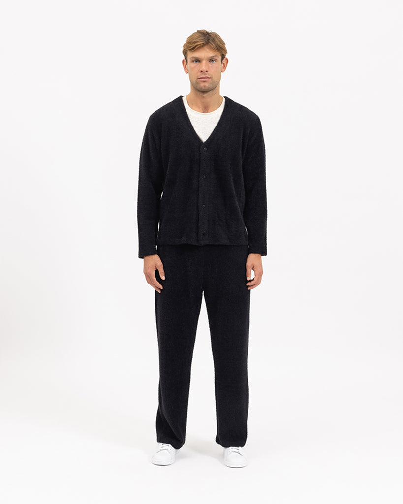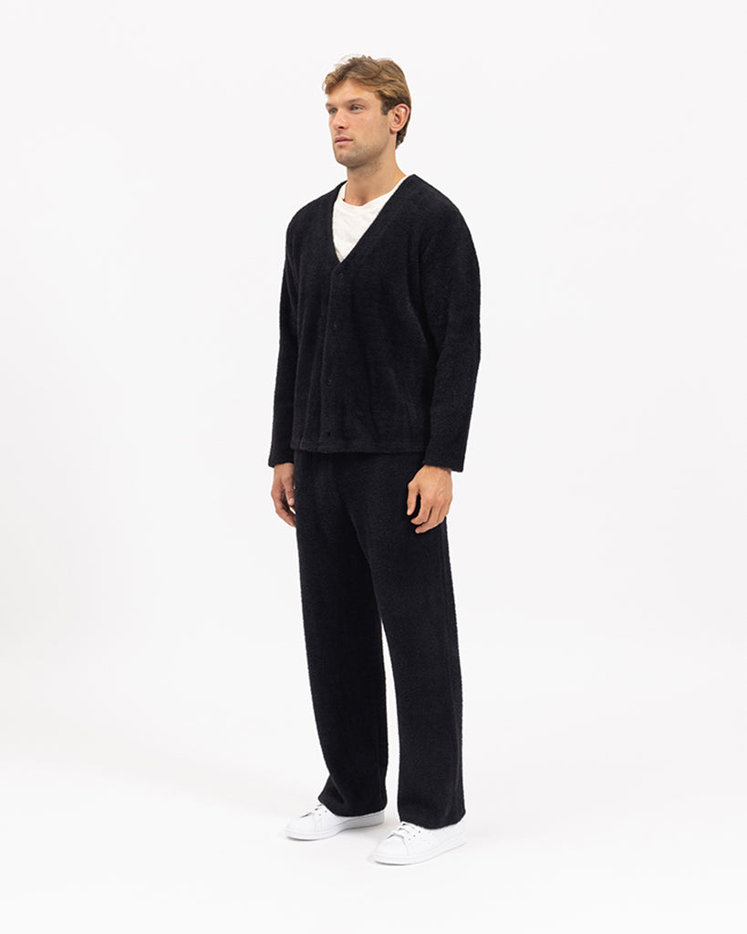 Introducing the Calobra Cardigan in Black. Constructed from a Supersoft brushback fabrication and an incredible handle, this garment provides a comfortable feel and relaxed silhouette whilst showcasing an evolution in fabric development. A showstopper on its own or worn with the plain Calobra pant and Serralta tee.