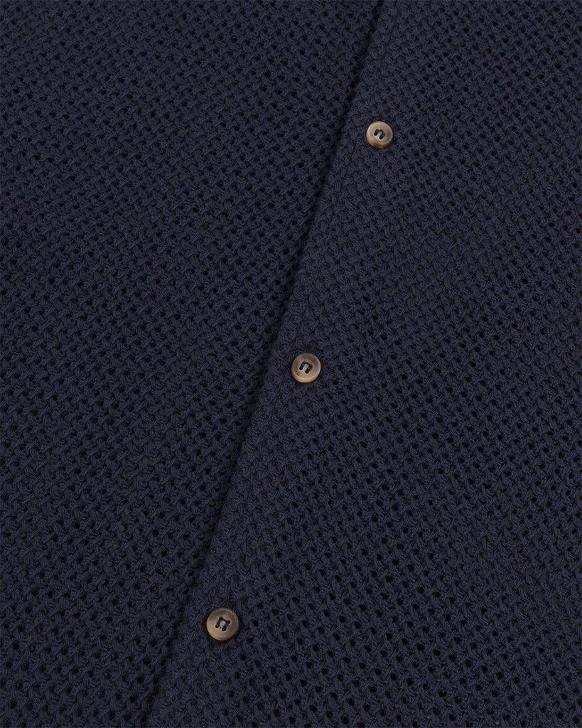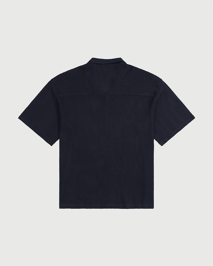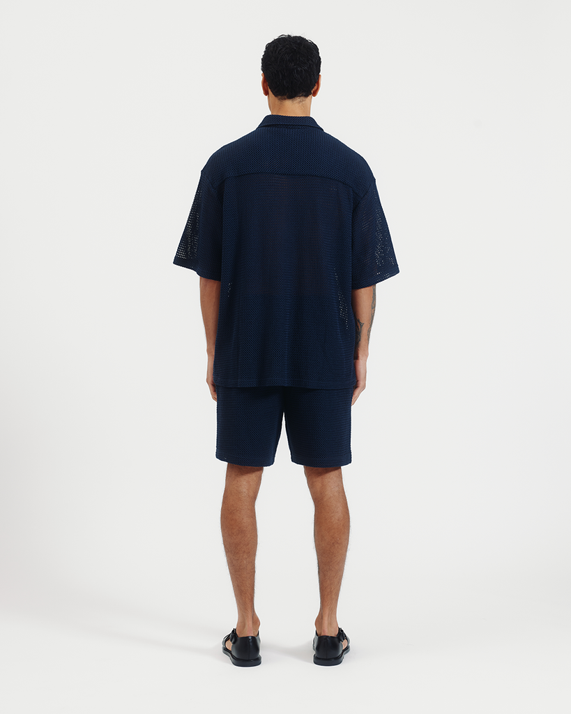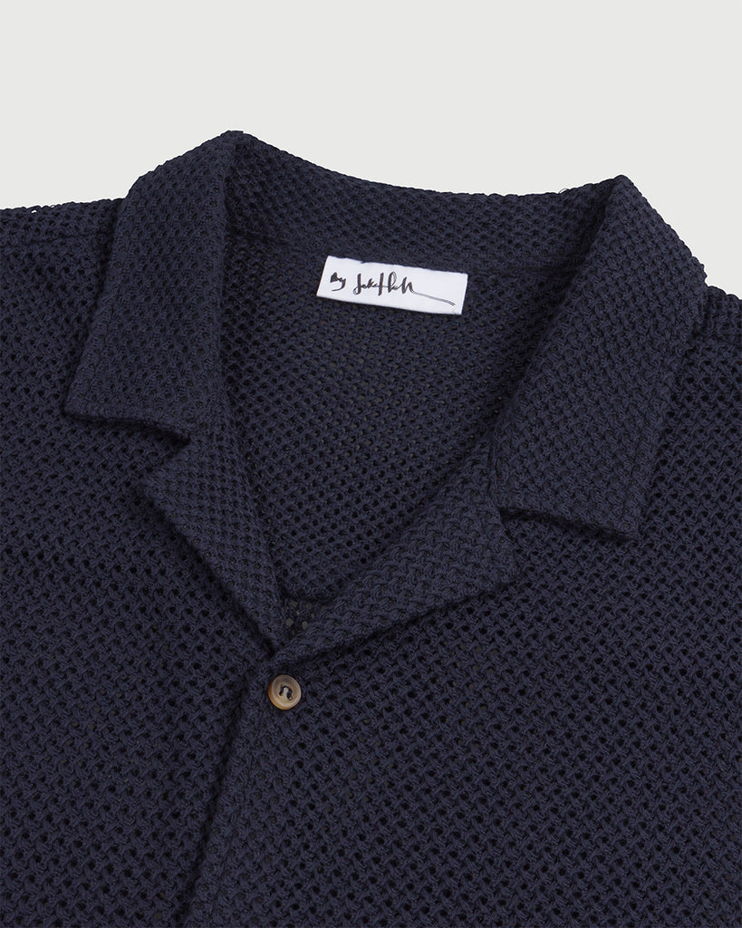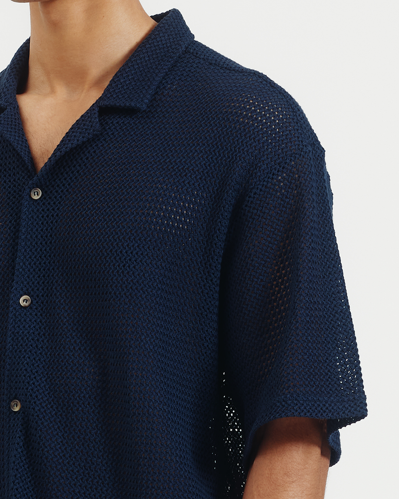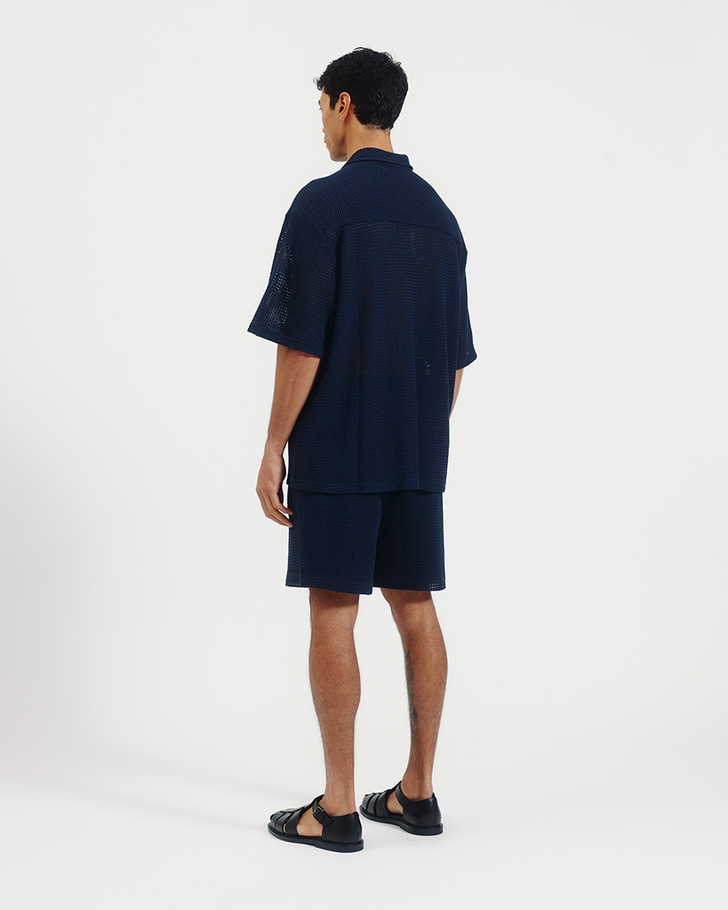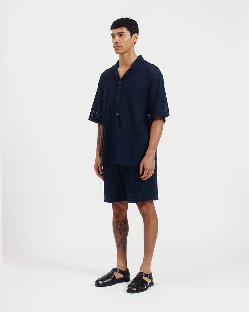 Introducing the Mateu crochet shirt in Navy. A textured, open weave shirt that breathes refinement. To be styled with lightweight trousers or paired with the matching Mateu short