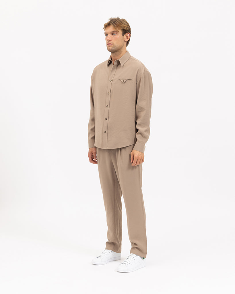 The Osaca Trouser in Sage. These transitional day-to-night trousers are the only elevated staple you need to carry you through all year round. Perfect as a solo wear or paired with the Osaca shirt.