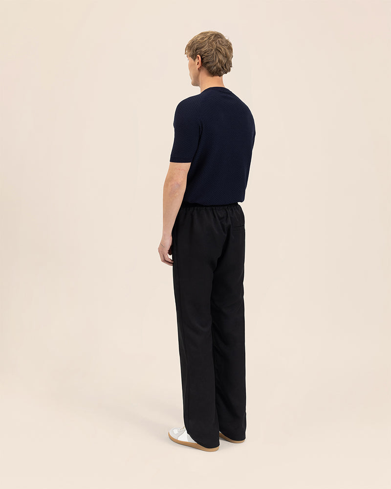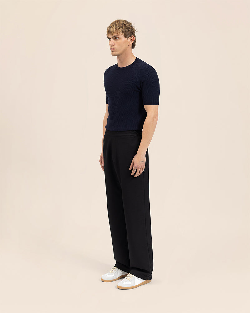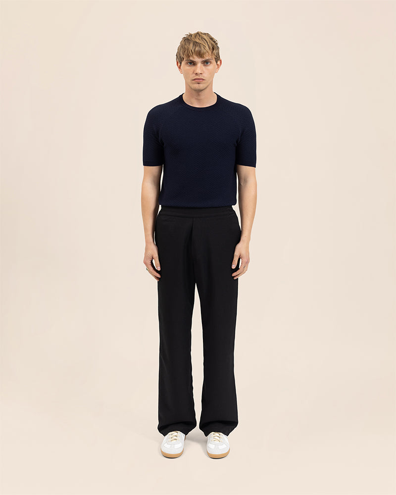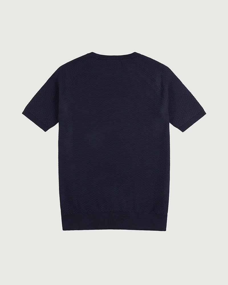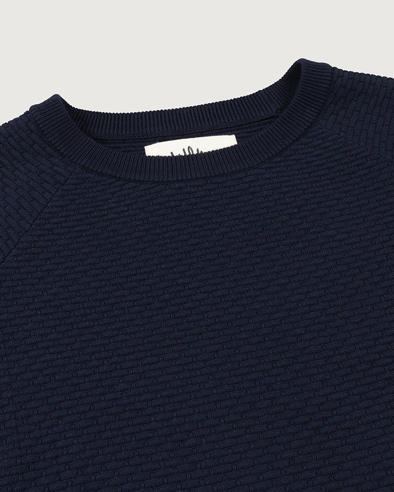 A new focus and direction for Spring Summer 2025 utilising luxurious wool blends. The Sineu Knitted Crew in Navy offers ultimate texture, comfort and shape retention. Crafted from a premium, fine knit fabrication, it features a soft, sumptuous touch, slim body and refined ribbed trims.